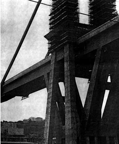 anzi irrealizzabili e proprio per questo risultano efficienti, logiche ed economiche per le ragioni del cemento armato. Morandi è stato per tutta la vita il nume di un'unione fortunata: quella tra il calcestruzzo da una parte e il ferro dall'altra. L'uno che risponde agli sforzi di compressione con la geometria e la massa delle sezioni, l'altro agli sforzi di trazione con l'elasticità del materiale, insieme, e per questo si parla di matrimonio fortunato, dilatandosi in maniera analoga alle sollecitazioni termiche. Il risultato è un materiale solidale, forte, indistruttibile, plasmabile in forme e schemi statici infinitivi che permette, attraverso la tecnica della precompressione, di raggiungere luci molto elevate e la realizzazione delle grandi opere della tecnica moderna. L'ingegnere Morandi, nato nel 1902, sperimenta le potenzialità del cemento armato e della precompressione in strutture a destinazione diversa, dalle abitazioni alle sale di spettacolo, dalle autorimesse agli hangar, dai ponti ai viadotti. ![]() Prima della guerra lavora in un intenso rapporto mecenate-progettista per la nuova città industriale di Colleferro operando a tutto campo dalla pianificazione alla realizzazione di stabilimenti e servizi. Negli anni Trenta si cimenta anche nella progettazione di sale di spettacolo; l'Augustus, ricavato all'interno di un edificio esistente che incunea una nuova struttura larga 18 metri che sopporta i tre piani superiori al cinema, e il Giulio Cesare, di ben 2000 posti il cui il dato caratterizzante è la balconata curvilinea che ospita la galleria. Il lavoro sulle sale di spettacolo ha il suo più importante episodio nella realizzazione del cinematografo Maestoso sempre a Roma della metà degli anni Cinquanta. Si tratta di un edificio pluriuso di 50.000 metri cubi che rappresenta lo stato dell'arte tecnologico del momento. E' un cinema da 2600 persone, sei abitazioni superiori, sale sotterranee per intrattenimenti e due braccia ad un piano per bar e tavola calda. L'insieme funziona da condensatore pubblicitario e commerciale in una periferia cresciuta tutta con le regole di una feroce speculazione. Morandi opera con schiettezza sulla diversità delle funzioni. Crea un pacchetto di abitazioni superiori rigorosamente seriali e rivela la funzione pubblica portando in facciata la scala del cinematografo visibile attraverso il vetro dei pannelli. L'interno del cinema è un canto strutturale di piedritti a sezione variabile che fanno viaggiare i pesi orizzontali delle balconate a sbalzo sino al loro punto di scarico. Ma l'intera costruzione è caratterizzata principalmente da sei portali zoppi che partono dall'atrio e, attraverso i 40 metri della sala, vanno a poggiare su un traverso che contiene lo spazio scenico. L'intera costruzione, compresi i tre piani di appartamenti superiori, risulta sostenuta da questo enorme telaio. Tecnicamente l'opera sfrutta il principio della precompressione alla quale Morandi ha attivamente lavorato sin dagli anni della guerra realizzando anche sette sistemi brevettati per la tensione dei cavi di acciaio. ![]() Nelle grandi costruzioni per gli aviogetti, Morandi realizza delle coperture appese sui supporti periferici per non avere ostacoli negli spazi di lavoro. Nel primo hangar, una mensola in aggetto di 60 metri sostenuta da stralli viene ripetuta identica in serie parallele, mentre in quello realizzato circa dieci anni dopo, la copertura è concepita come una tenda sostenuta da tiranti con sviluppo radiale a partire dai tre supporti verticali. In entrambi i casi il cemento armato viene adoperato perseguendo l'idea e l'immagine di leggerezza dei reticoli di stralli contro il cielo. Nella struttura ipogea torinese di 69 metri di ampiezza 151 di lunghezza e otto di altezza, lo sforzo è al contrario nella ricerca plastica e nel ritmo delle potenti travature a sezione variabile che si raccolgono nei supporti inclinati e incernierati al suolo, già sperimentati in tanti ponti. La costruzione viene allo stesso tempo irrigidita e dinamicamente scandita attraverso l'abbinamento dei ritti, che ne spezza una monotona ripetizione seriale, e con l'incrocio delle travature le quali, congiungendo in obliquo ritti sfalsati, crea in mezzeria dei rombi di vetrocemento da cui penetra la luce. Se negli involucri dei suoi edifici l'ingegnere rivela qualche rigidezza ed elementarità, in questo salone sotterraneo e nei suoi molti ponti è completamente libero di integrare in un unico gesto calcolo, schema statico e spazio architettonico. Ciò rende vana ogni distinzione tra tecnica e arte (o tra ingegneria e architettura) e dà forma a quell'attimo fuggente che per Morandi è l'equilibrio. ![]() Un capitolo internazionalmente noto della sua attività viene segnato dai ponti e dai viadotti, realizzazioni in cui si coagula lo sforzo tecnico verso l'attraversamento di grandi distanze alla tensione tridimensionale delle membrature. Anche qui l'ingegnere sperimenta: dalle strutture a trave a quelle ad arco ai sistemi con stralli e telai. Del primo caso basti ricordare il cavalcavia a Corso Francia a Roma e il Ponte Vespucci a Firenze in cui l'aspetto tecnico della precompressione viene risolto nella elegante essenzialità dei profili e nella tensione estetica verso l'orizzontale; del secondo, il ponte sullo Storms River in Sudafrica nel quale la realizzazione (basata sulla rotazione di due archi costruiti in verticale e poi abbassati ad appoggiarsi in chiave) è altrettanto importante della progettazione stessa. Ma le opere più importanti e interessanti si fondano su uno schema lontano da ogni struttura voltata o trilitica del passato. Risulta formato da due compassi strutturali ribaltati che determinano i supporti verticali. Il primo, più piccolo, è incernierato sulla base di appoggio e sorregge a mensola la prima parte della travatura, mentre il secondo - più grande - si impenna nello spazio ad ancorare gli stralli cui è appeso il secondo tratto della travatura. Le